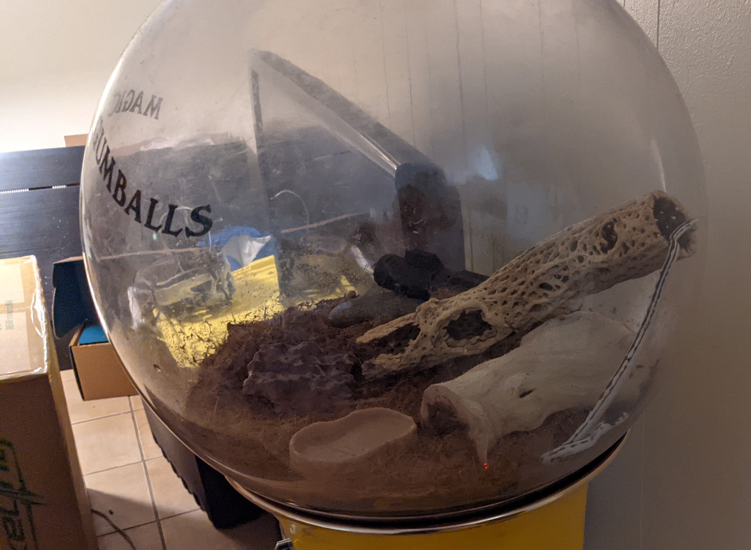 I converted a gumball machine into a home fit for any reptile. This was a super fun and involved project, complete with a functioning dispensing mechanism. To seperate the top portion, I designed and 3D printed a base and sealed it with silicone. The middle lock rod was removed, and I moddified the coin mechanism to not require quarters. I even routed the heater's power cable through the old coin funnel. Lastly, the top is removable with the help of some velcro strips. Below is a video of the dispenser in action: