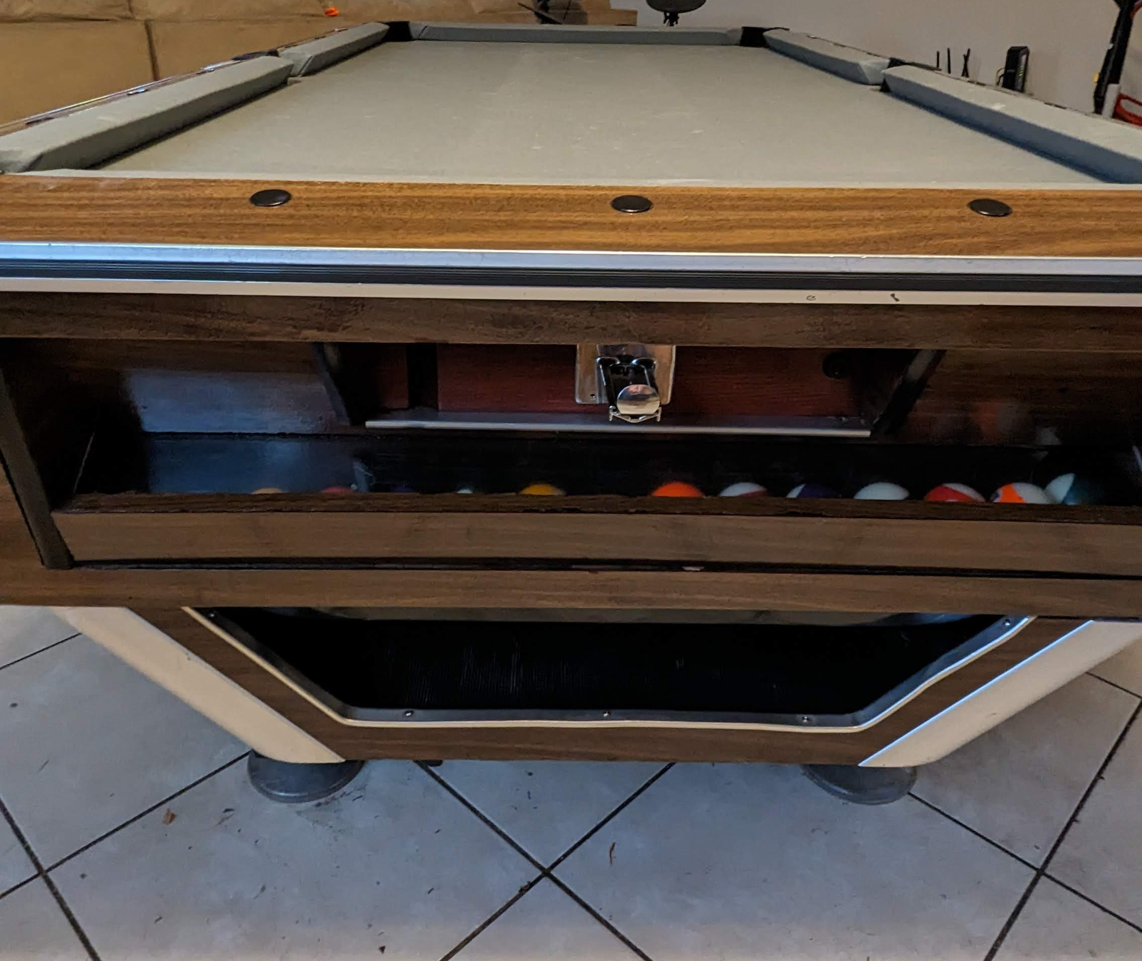 This has been my most involved and complicated project to date. I have always wanted to upgrade from my old wooden table and I jumped at the chance to restore this old one I purchased used. I have redone every aspect of the table from head to toe. I am most proud of the coin mechanism, as I have made that 100% custom as the original mechanism was missing. The table now plays excellentlly, with the balls having little friction and plenty of bounce off the rails. And it is perfectly level - a big step up from the previous table. Repairs included: cleaning, sealing wood frame from moisture, finishing the veneer siding with polyurethane, removing old felt and cleaning slate, gluing new felt onto the slate, cleaning de-rusiting and painting all internal metal parts, polishing alluminum parts, replacing rail bumpers with new rubber, refelting the rails, making custom wooden insert for the coin mechanism, seperately refurbishing the coin op from a different machine, and finally all pieces coming together. All in all, this project was a tonn of work and took around 3 weeks to complete. Completely worth it for the quality of game the table provides. I plan on making my own pool que in the near future.
